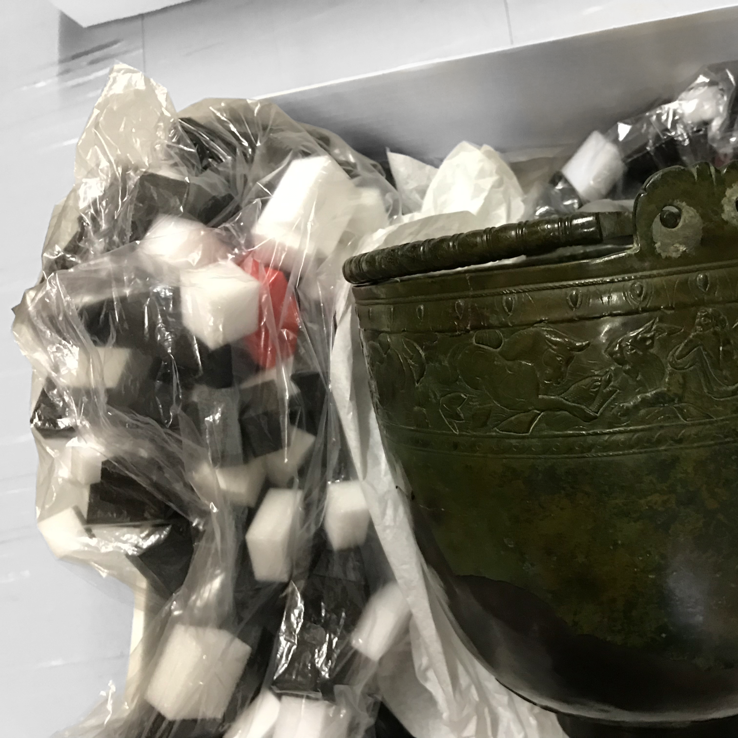 ”Vi har testet Plastazote® i en længere periode, og der er ingen tvivl om, at det er den helt rigtige skumtype til at beskytte vores kunstskatte. Vi får Plastazote® fra Linde+Larsen, som er skåret op i klodser på max. 4×4 cm og når vi modtager skummet, fryser vi skummet ned til -40 grader for at sikre at skade dyr ikke er til stede”, fortæller Frederik.